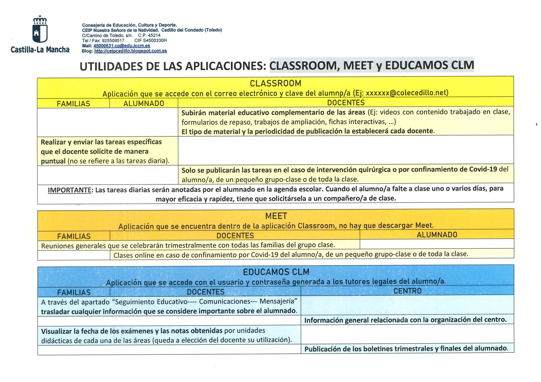 información también ha sido enviada a las familias a través de Educamos CLM.